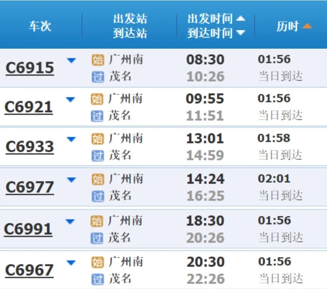 茂名站位于江湛鐵路上,是一個運營城際列車和普速鐵路的混合車站。廣州南至茂名的城際列車日常開行45對,周末增加至52對,將茂名到廣州的旅行時間縮短至2小時左右,十分方便。