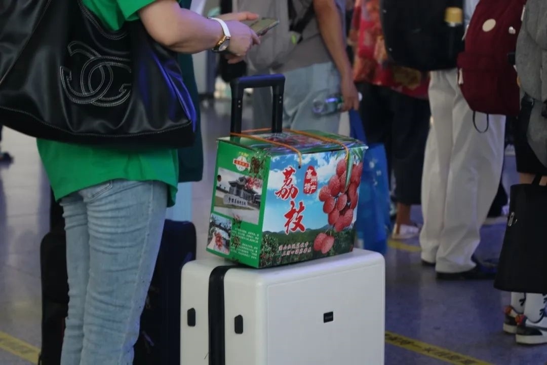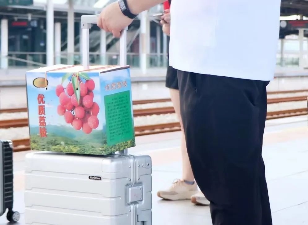 “我們會提前留足票源、增加運力、增設安檢口,方便旅客快速進站。安檢口提前備好透明膠帶,提供給攜帶荔枝的旅客加固包裝使用。”茂名站站長陳桓介紹。