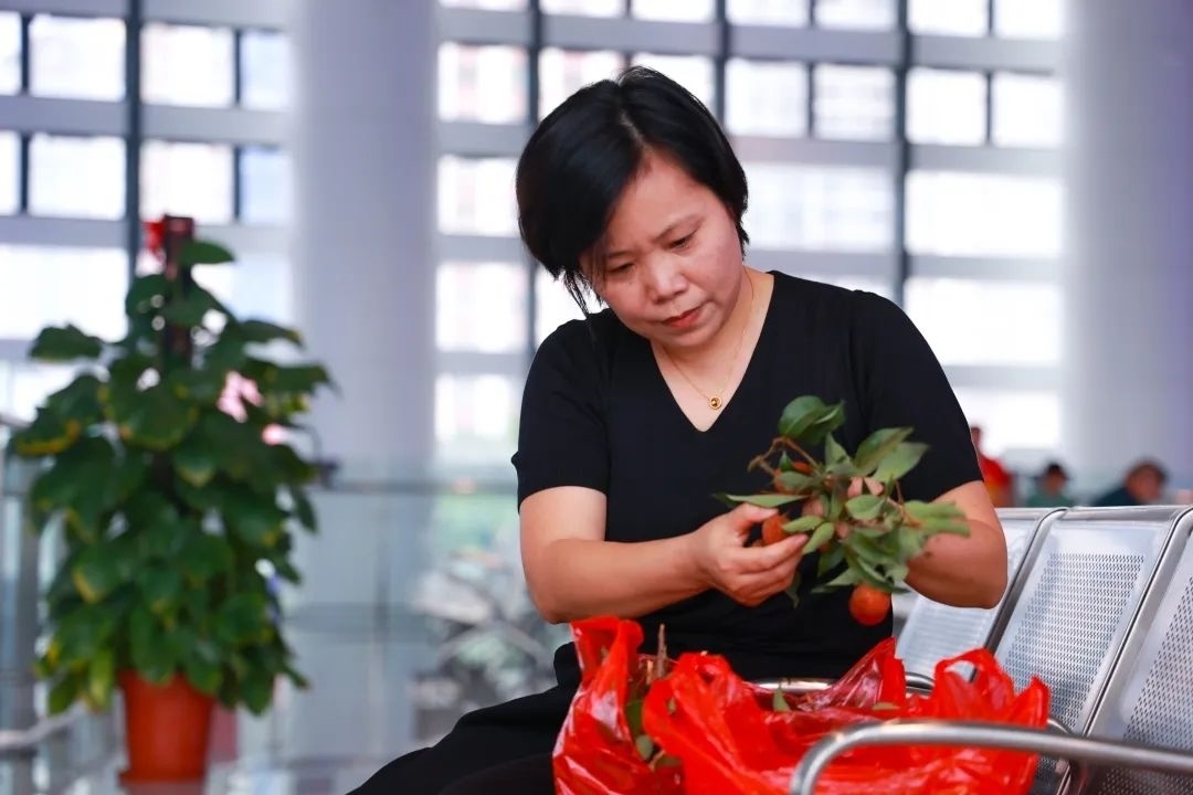 寬敞明亮的候車室內,旅客蘭海英正利用候車時間打理剛買到的荔枝。她是從廣州到茂名出差,看到有新鮮荔枝上市,馬上買了12斤白糖罌。