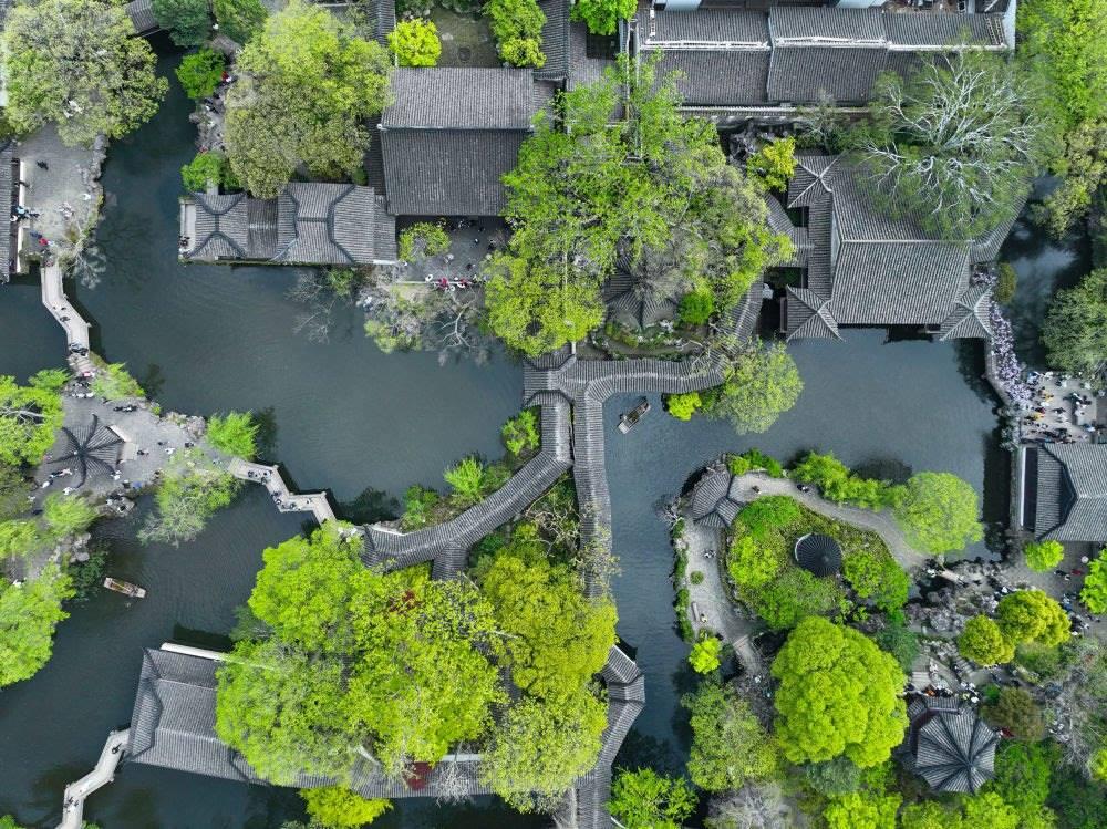 這是2023年4月5日拍攝的江蘇蘇州拙政園一景(無(wú)人機(jī)照片)。新華社記者 李博 攝