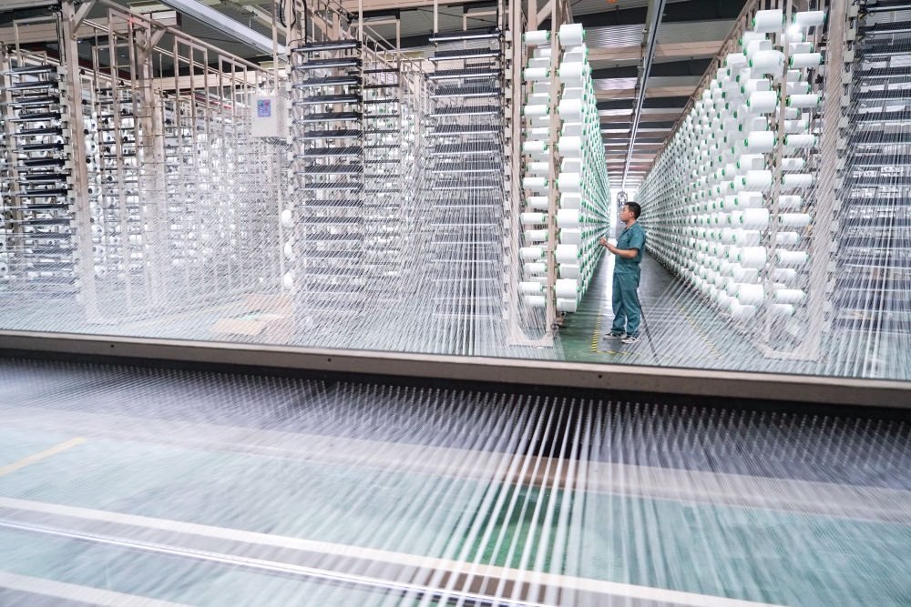 工人在位于蘇州市吳江區(qū)盛澤鎮(zhèn)的恒力集團(tuán)博雅達(dá)紡織智能車間作業(yè)(2021年5月14日攝)。新華社記者 李博 攝