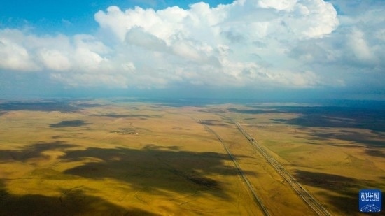 這是5月30日拍攝的內(nèi)蒙古錫林郭勒盟蘇尼特右旗境內(nèi)的草原風(fēng)光(無(wú)人機(jī)照片)。