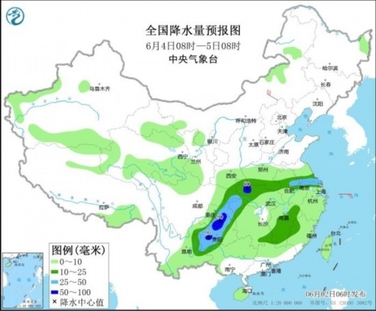 6月2日08時至3日08時,甘肅東南部、陜西南部、四川東部、重慶大部、貴州中北部、湖南西北部、湖北西部、廣東東南部等地有中到大雨,其中,四川東北部、重慶東北部和南部、貴州北部和東部等地部分地區(qū)有暴雨,貴州北部局地有大暴雨(100~120毫米)。新疆南疆盆地、內(nèi)蒙古中部、遼寧中部等地部分地區(qū)有4~6級風(fēng),其中,甘肅河西部分地區(qū)有6~7級風(fēng)。受臺風(fēng)“瑪娃”影響,東海東部海域?qū)⒂?~8級、陣風(fēng)9~10級的大風(fēng)。南海南部海域?qū)⒂?~6級、陣風(fēng)7級的西南風(fēng)。