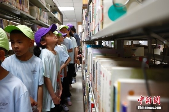 圖為一個藏族女孩抬頭望向書架。富田攝