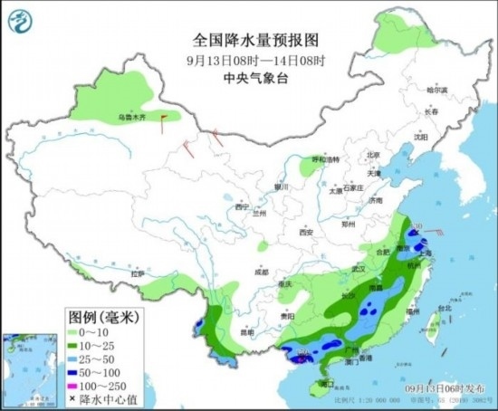 全國降水量預(yù)報圖(9月13日08時-14日08時)