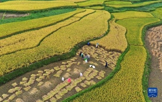 9月14日,湖北省秭歸縣九畹溪鎮(zhèn)石柱村村民在田間收獲稻谷(無人機(jī)照片)。