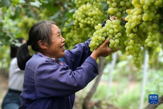 9月14日,果農(nóng)在貴州省開陽縣南江鄉(xiāng)龍廣村水果種植基地采摘醉金香葡萄。