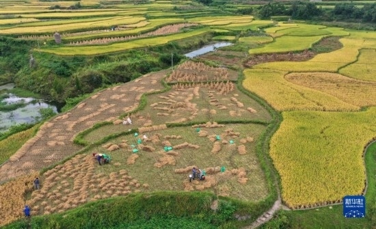 金秋時(shí)節(jié),各地農(nóng)民搶抓晴好天氣忙收獲,田間地頭一派繁忙景象。新華社發(fā)(羅大富 攝)
