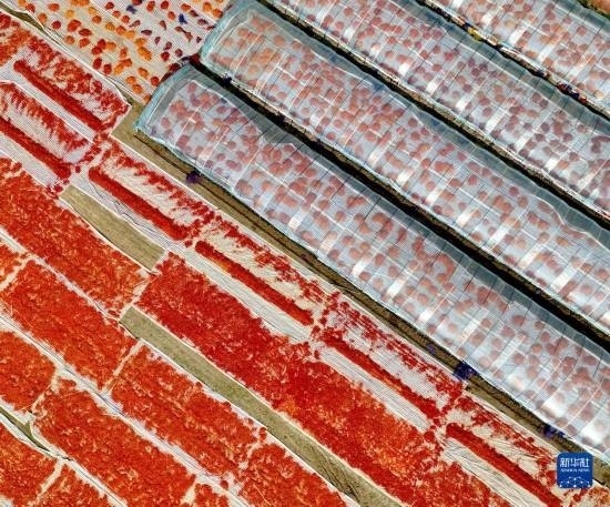 9月13日,村民在貴州省畢節(jié)市大方縣理化鄉(xiāng)金雞村查看辣椒烘干情況。