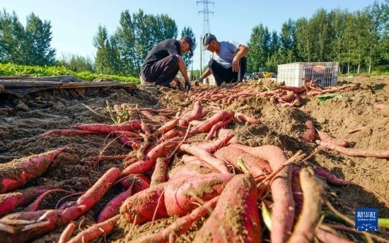 9月14日,河北省唐山市海港經(jīng)濟(jì)開發(fā)區(qū)王灘鎮(zhèn)農(nóng)民在田間收獲紅薯。