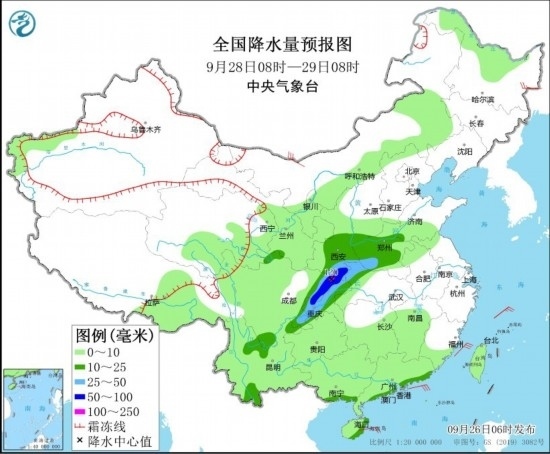 9月28日08時(shí)至29日08時(shí),西北地區(qū)東南部、陜西中部、黃淮西部、江漢西部、西南地區(qū)東北部、廣西東南部沿海、廣東東南部沿海等地部分地區(qū)有中到大雨,其中,陜西南部、四川盆地東北部、重慶東北部和西部等地部分地區(qū)有暴雨或大暴雨(100~120毫米)。黑龍江東北部部分地區(qū)有4~5級風(fēng)。