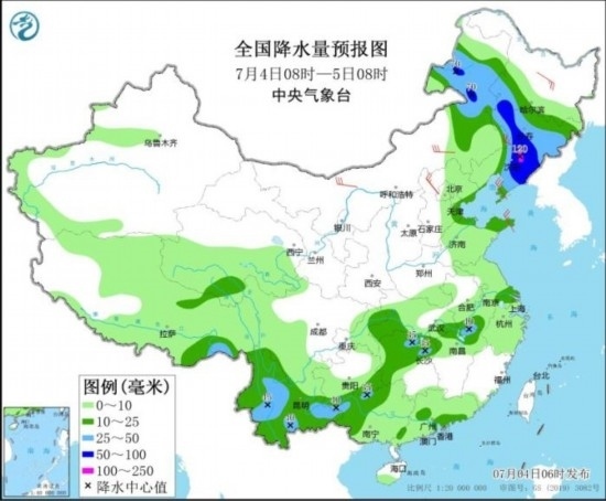 全國降水量預(yù)報圖(7月4日08時-5日08時)。圖片來源:中央氣象臺網(wǎng)站