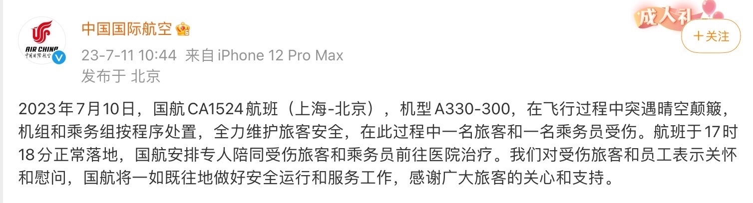 7月11日,中國國際航空在其官方微博發(fā)布通報(bào):2023年7月10日,國航CA1524航班(上海-北京),機(jī)型A330-300,在飛行過程中突遇晴空顛簸,機(jī)組和乘務(wù)組按程序處置,全力維護(hù)旅客安全,在此過程中一名旅客和一名乘務(wù)員受傷。航班于17時(shí)18分正常落地,國航安排專人陪同受傷旅客和乘務(wù)員前往醫(yī)院治療。