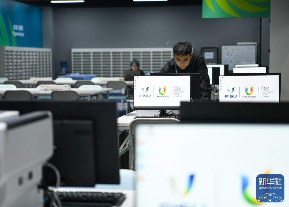 ↑7月13日,在成都大運會主媒體中心,工作人員正在調(diào)試媒體工作間的電腦。新華社記者 王曦 攝
