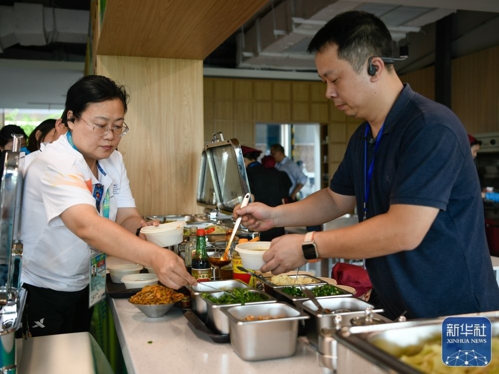 ↑7月14日,工作人員在成都大運會主媒體中心媒體餐廳內(nèi)就餐。新華社記者 胥冰潔 攝