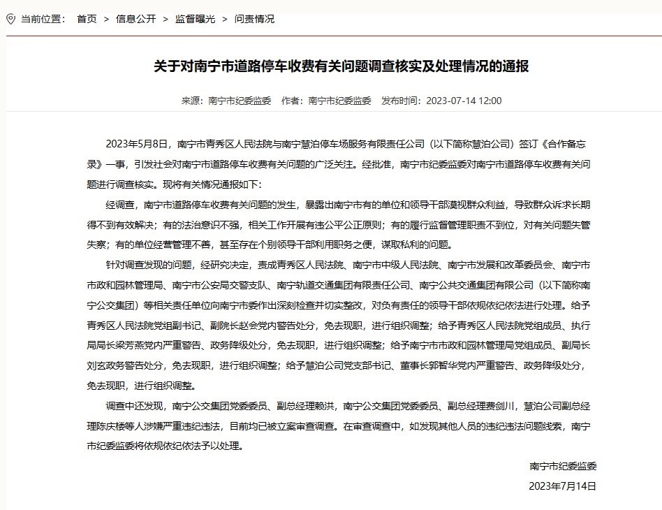 ·南寧通報道路停車收費有關(guān)問題處理情況:4人被免職。