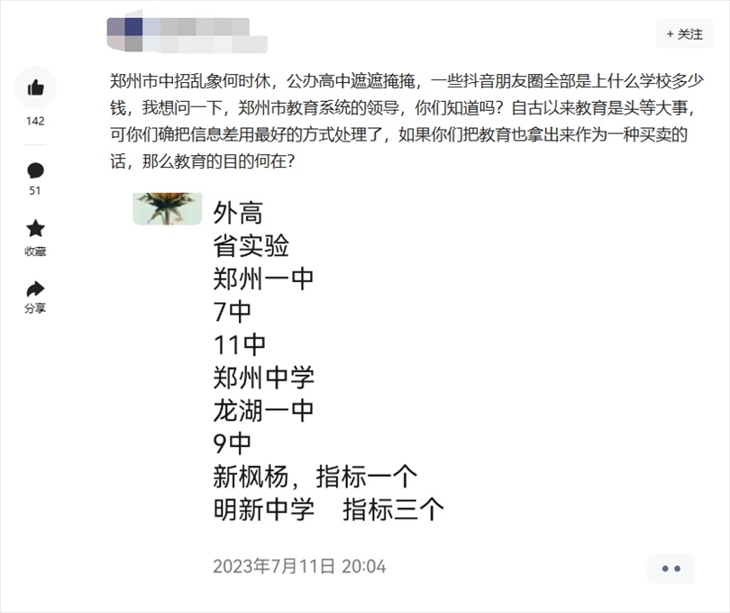 7月16日,有群眾通過頂端新聞“我想@領(lǐng)導(dǎo)”平臺向鄭州市教育局局長留言:“掏錢就能上?鄭州中招販賣名額成風(fēng)”“公開賣高中名額,鄭州教育局都不管嗎”等類似留言。