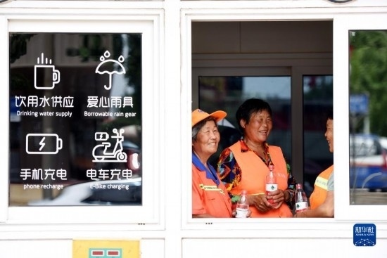 7月21日,山東省臨沂市郯城縣環(huán)衛(wèi)工人在“愛心驛站”消暑納涼。新華社發(fā)(房德華 攝)