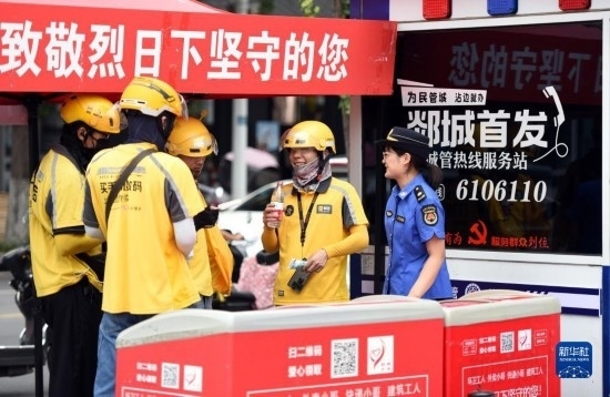 7月21日,在山東省臨沂市郯城縣“愛心驛站”,城管隊員為外賣小哥送上冰鎮(zhèn)水。新華社發(fā)(房德華 攝)