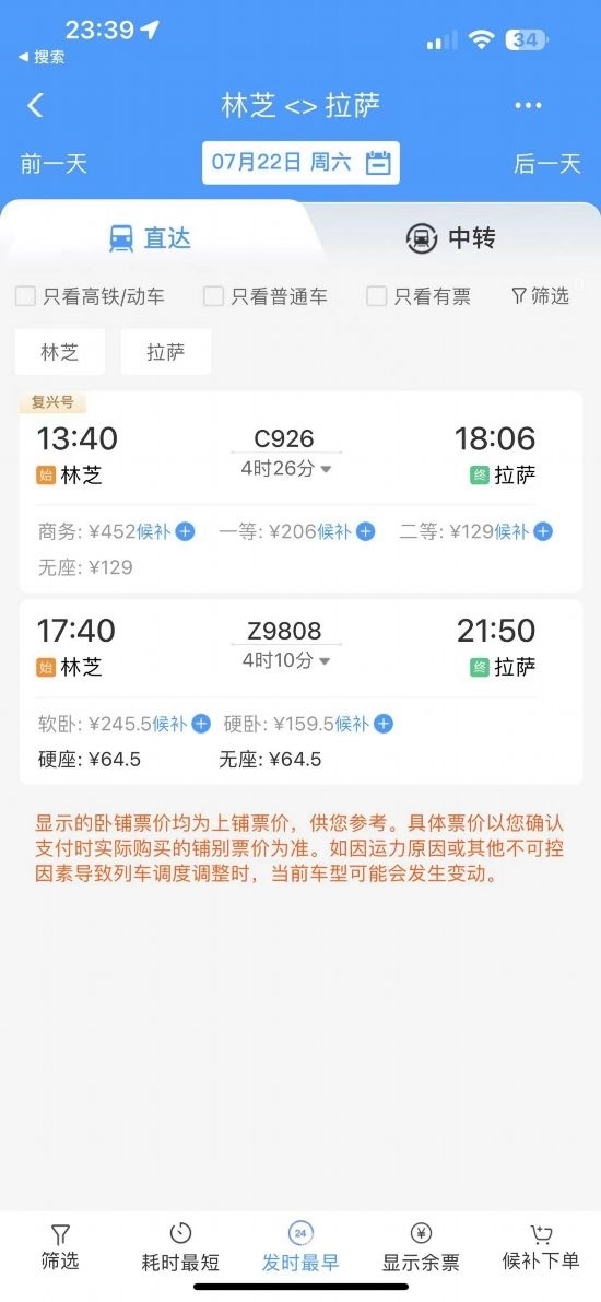 通過(guò)在鐵路售票APP上查詢(xún)發(fā)現(xiàn),從林芝開(kāi)往拉薩的復(fù)興號(hào)城際列車(chē)的二等座票價(jià)為129元,直達(dá)特快列車(chē)硬座為64.5元?!跋啾容^原先180元的客運(yùn)汽車(chē)票價(jià),直達(dá)特快列車(chē)便宜了近乎三分之一。”曹先生感慨地說(shuō)道。