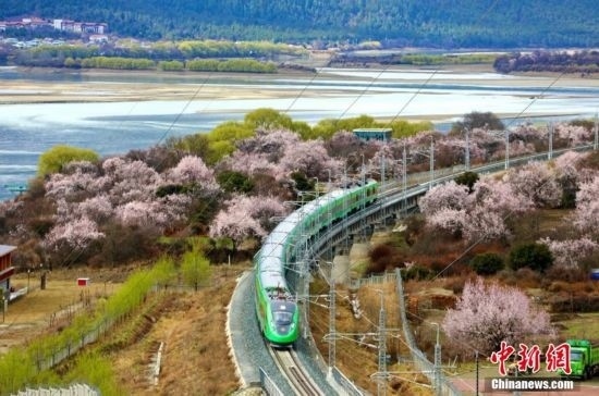 資料圖:桃花、嫩柳與國(guó)槐綠涂裝的高原復(fù)興號(hào)。 馬生明 攝