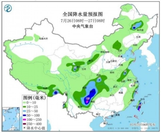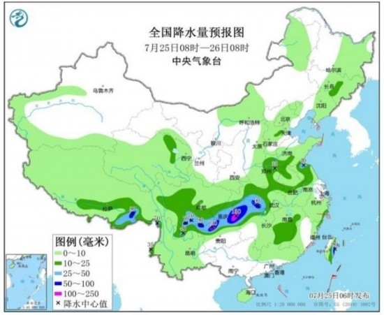 預(yù)計(jì),7月25日08時(shí)至26日08時(shí),重慶中南部、四川南部、云南東北部、貴州北部、湖南西北部、湖北西部以及江蘇北部、西藏東南部、臺(tái)灣島東部等地的部分地區(qū)有大到暴雨,其中,重慶東南部、四川南部、貴州北部等地局地有大暴雨(100~150毫米)(見圖1);上述部分地區(qū)伴有短時(shí)強(qiáng)降水(最大小時(shí)降雨量20~50毫米,局地可超過70毫米),局地有雷暴大風(fēng)等強(qiáng)對(duì)流天氣。中央氣象臺(tái)7月25日06時(shí)繼續(xù)發(fā)布暴雨藍(lán)色預(yù)警。