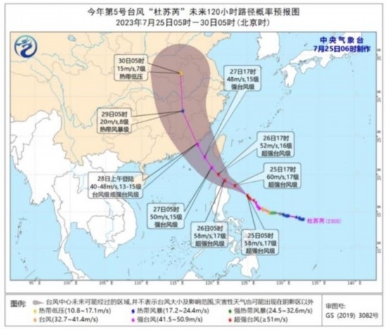 圖2 臺(tái)風(fēng)“杜蘇芮”未來120小時(shí)路徑概率預(yù)報(bào)圖(7月25日05時(shí)-30日05時(shí))