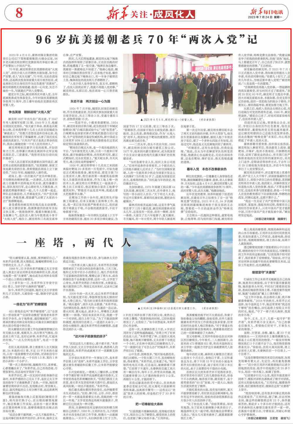 70年前,顧克明曾在抗美援朝戰(zhàn)場(chǎng)“火線(xiàn)入黨”,卻因介紹人壯烈犧牲未能如愿,如今莊嚴(yán)宣誓,老人“此生無(wú)憾”。70年間,無(wú)論在戰(zhàn)場(chǎng)殺敵,還是兩次投身國(guó)家重大項(xiàng)目艱苦創(chuàng)業(yè),或是離休后用自身經(jīng)歷作為紅色教育“活教材”,顧克明都絕無(wú)畏縮逃避,他用一心向黨、矢志不渝的一生,寫(xiě)就最莊嚴(yán)的入黨誓詞。