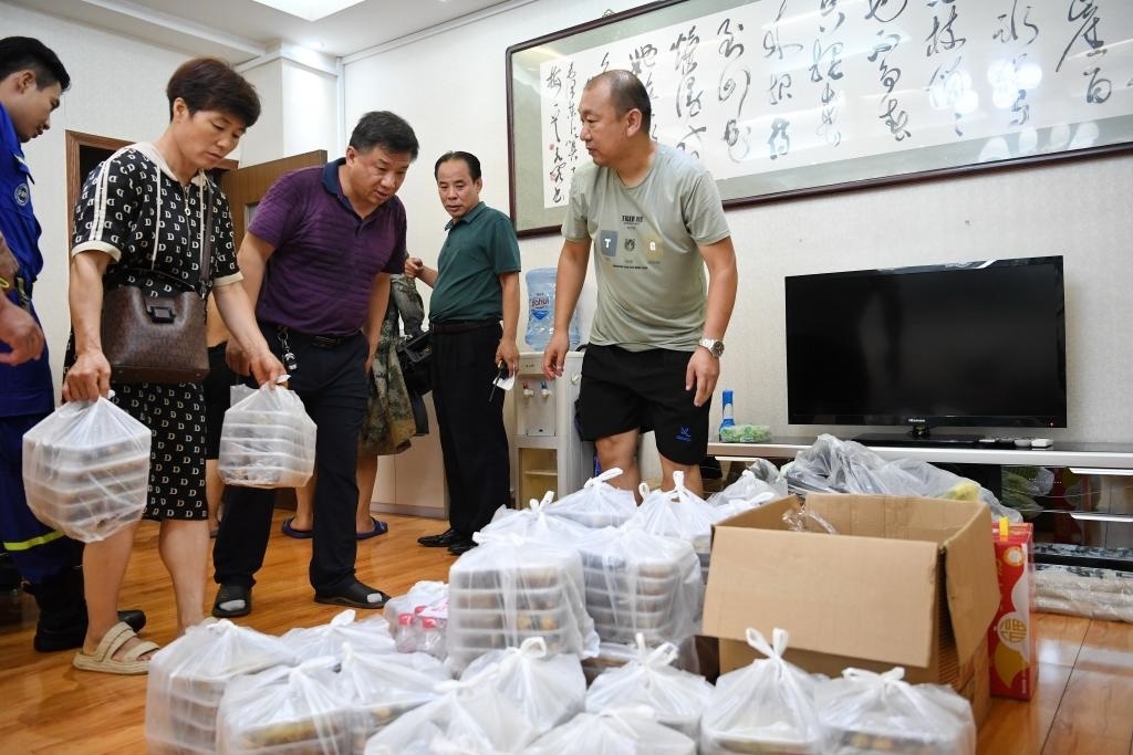 8月1日晚,河北省涿州市職業(yè)技術教育中心的工作人員正在運送飯菜,準備發(fā)放給安置群眾。新華社記者 牟宇 攝