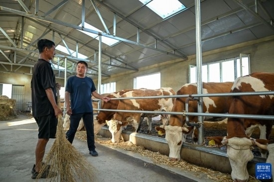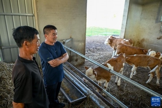 8月3日,在扎魯特旗巨日合鎮(zhèn),百順養(yǎng)殖專業(yè)合作社負責人楊紹武(右)和養(yǎng)殖戶李和查看牛犢繁育情況。