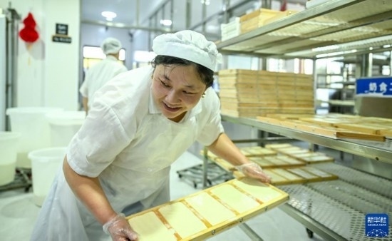 8月3日,在扎魯特旗百順養(yǎng)殖專業(yè)合作社,一名工作人員制作奶豆腐。