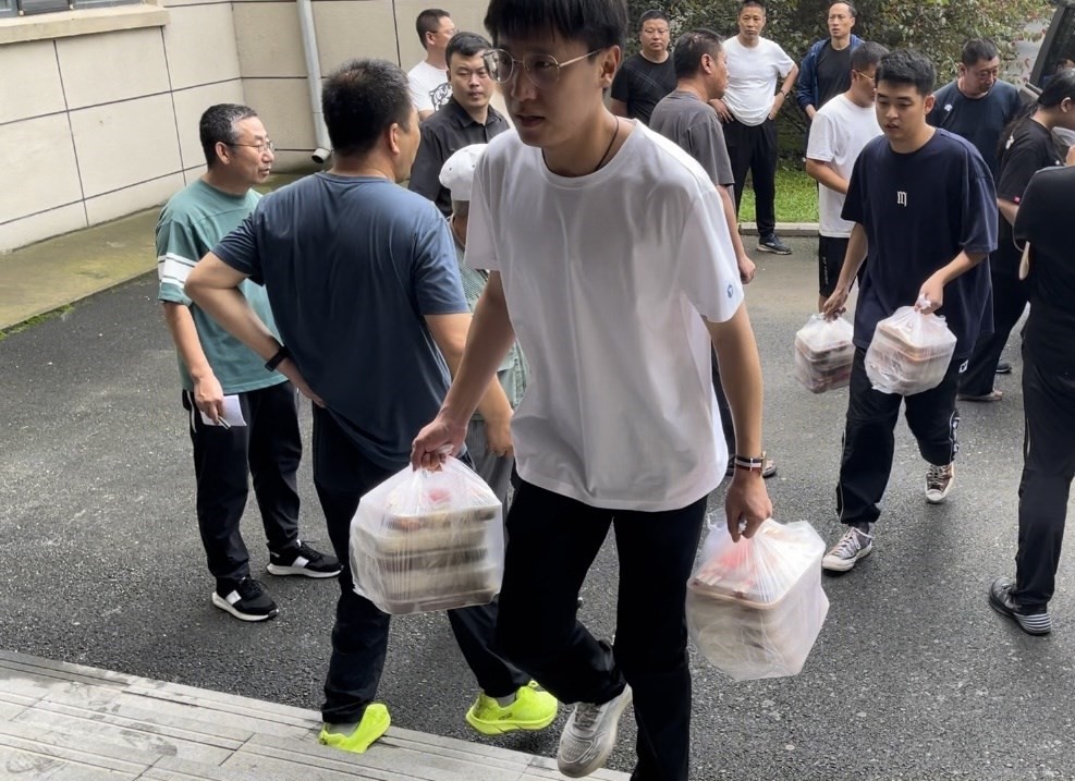 8月4日中午,工作人員將午餐送到宿舍樓。新華社記者劉昊東 攝
