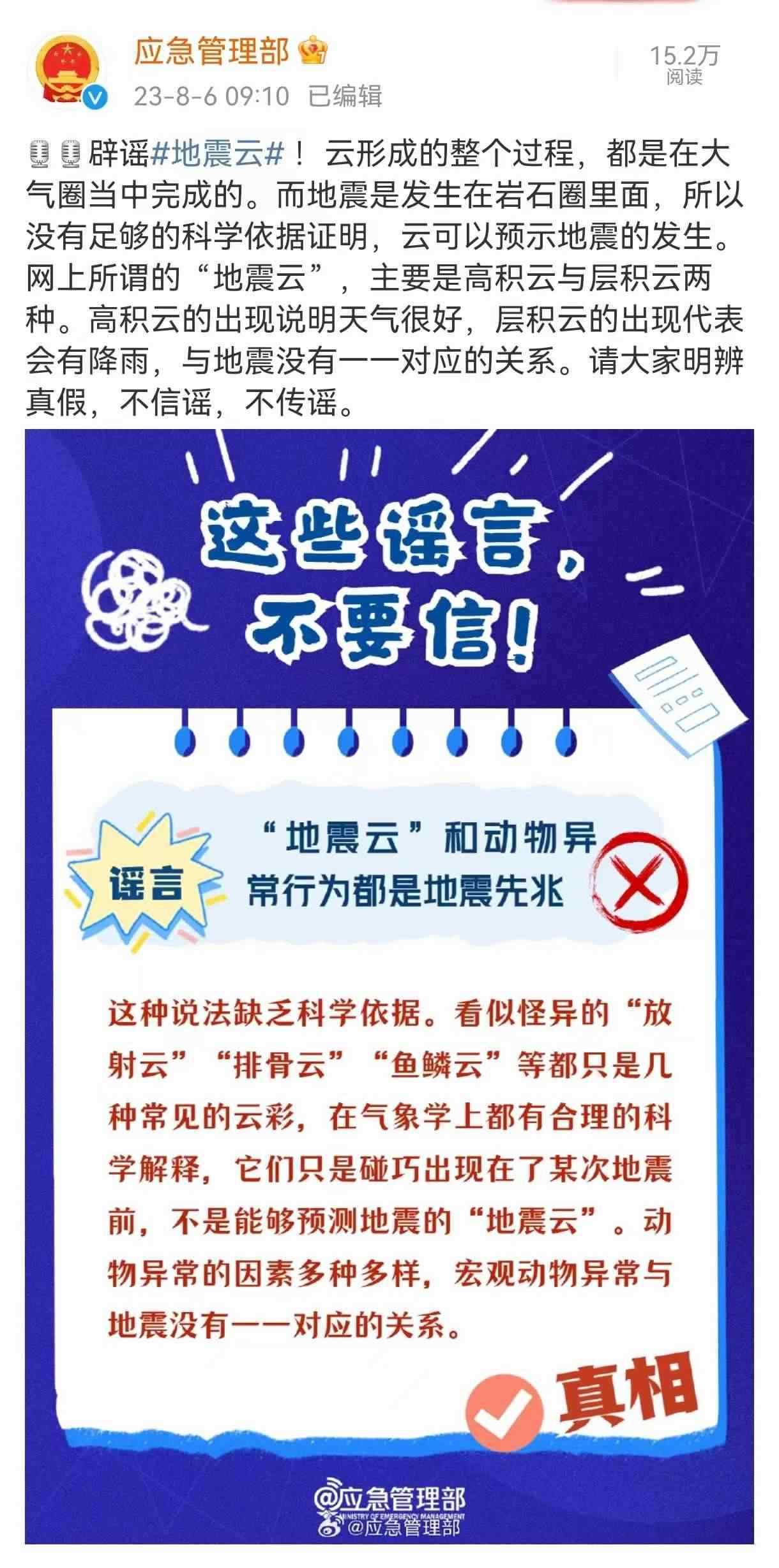 人民網(wǎng)北京8月6日電 (周靜圓)據(jù)中國地震臺(tái)網(wǎng)正式測定:8月6日2時(shí)33分在山東省德州市平原縣發(fā)生5.5級地震,震源深度10千米。地震發(fā)生后,有網(wǎng)友曬出自己拍下的云層,有關(guān)“地震云能預(yù)測地震”的說法在網(wǎng)絡(luò)上廣泛傳播。8月6日,應(yīng)急管理部官方微博就所謂“地震云”相關(guān)說法進(jìn)行辟謠。