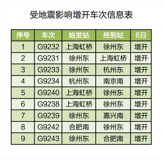 央視網(wǎng)消息:據(jù)長三角鐵路微信公眾號6日消息,受8月6日山東省德州市平原縣發(fā)生5.5級地震影響,為確保列車運行安全,鐵路部門計劃對途經(jīng)京滬高鐵部分列車采取限速、停運等措施;同時,根據(jù)旅客出行需要,計劃增開途經(jīng)京滬高鐵長三角管內(nèi)區(qū)段部分列車,滿足管內(nèi)旅客出行需要。截至當(dāng)日11時30分,計劃停運92趟列車、增開9趟列車。