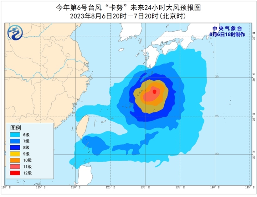 大風(fēng)預(yù)報:8月6日20時至7日20時,巴士海峽、臺灣海峽北部、臺灣以東洋面、東海南部和東部及釣魚島附近海域?qū)⒂?-8級、陣風(fēng)9-10級的大風(fēng),其中東海東部部分海域風(fēng)力可達9-10級,陣風(fēng)11-12級。