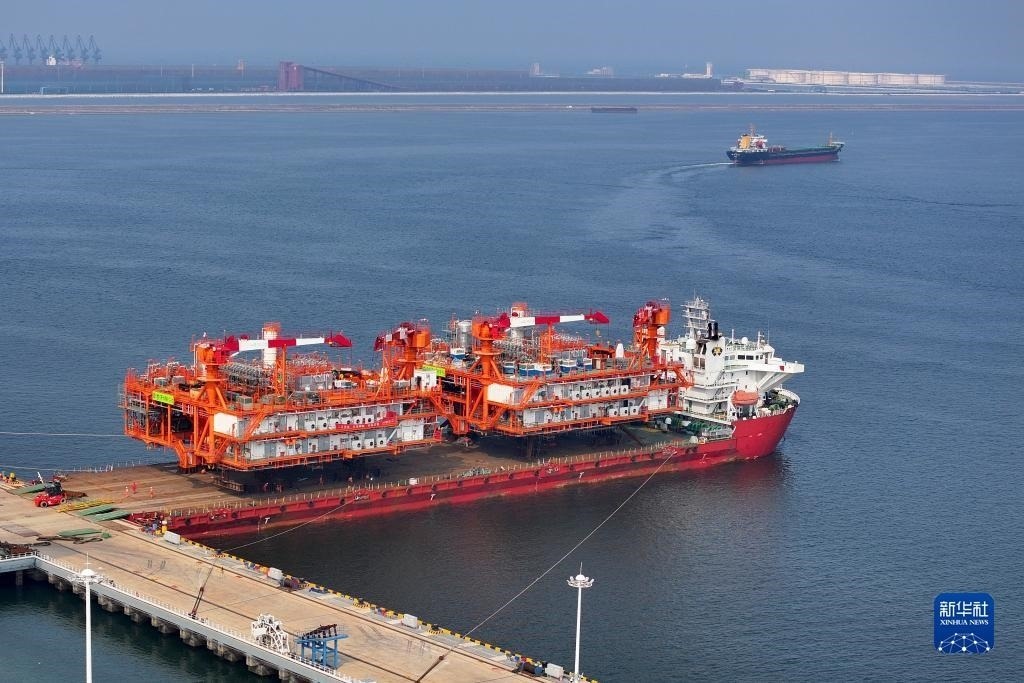 這是8月9日在天津?yàn)I海新區(qū)拍攝的渤中19-6凝析氣田I期開發(fā)項(xiàng)目組塊裝船作業(yè)現(xiàn)場。組塊裝船后將赴渤海西部海域,進(jìn)入海上安裝和聯(lián)調(diào)階段。
