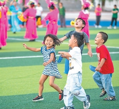 8月9日,小朋友在黑龍江省五常市時代中學(xué)集中安置點玩耍。新華社記者 張 濤攝