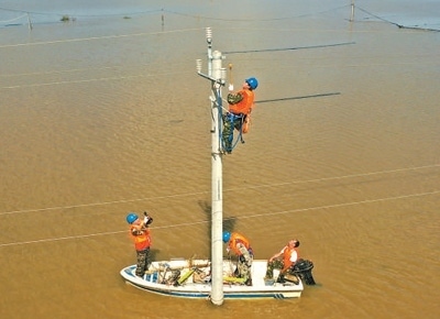 8月9日,國網(wǎng)長春供電公司搶修人員在吉林省榆樹市懷家12組進行作業(yè),為受災(zāi)群眾恢復(fù)生活用電。孟海鷹 張 鵬攝影報道