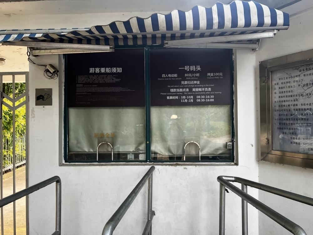 當(dāng)記者問起是否有現(xiàn)金購買渠道時(shí),工作人員指路了附近的人工售票窗口,同時(shí)補(bǔ)充道:“收受現(xiàn)金的售票員有時(shí)會(huì)離開崗位,不久會(huì)回來?!庇浾咴诖说赝A袅艘恍r(shí),注意到長風(fēng)公園內(nèi)類似的售票窗口有兩個(gè),營業(yè)至16:30。然而,整整一個(gè)小時(shí)內(nèi),兩個(gè)窗口均無人在崗。