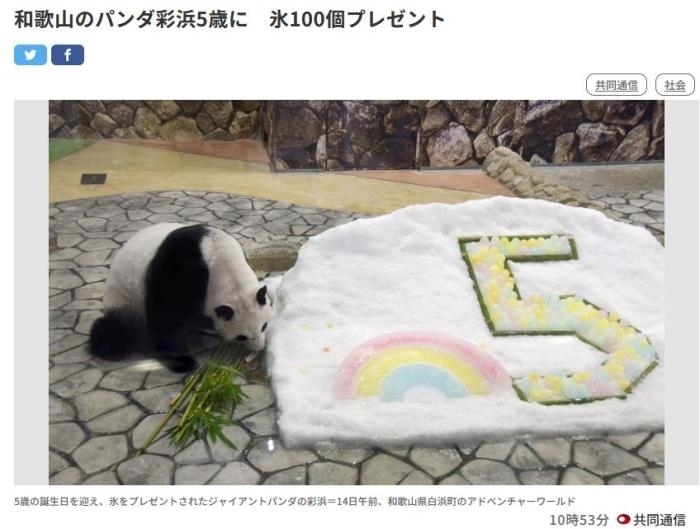 ·旅日大熊貓“彩濱”迎五歲生日,園方為它送上禮物。