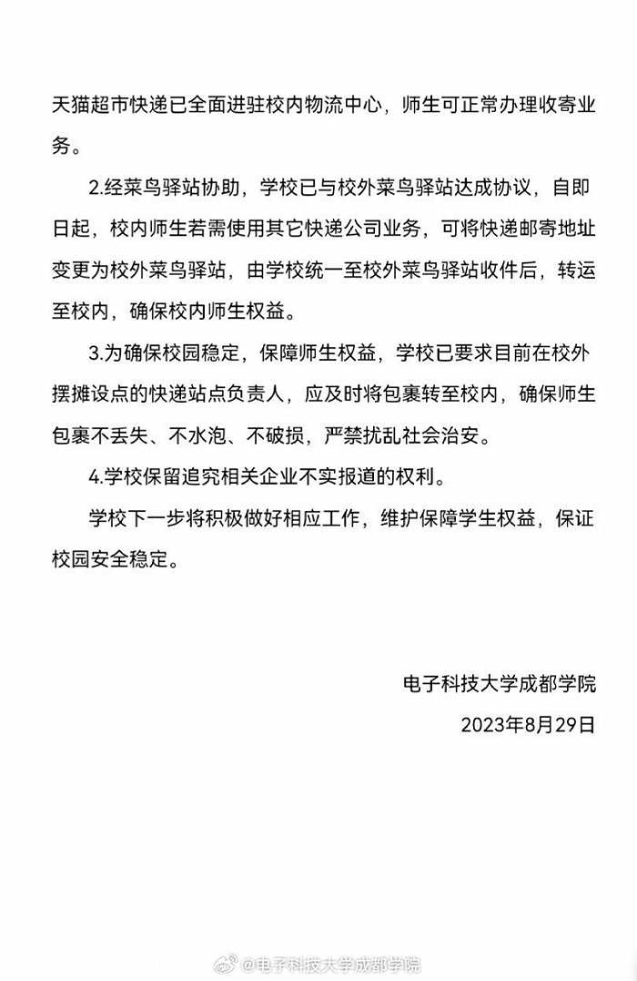 央視網(wǎng)消息:@電子科技大學(xué)成都學(xué)院 微博8月29日就網(wǎng)傳“成都一高校拒絕快遞進(jìn)?!卑l(fā)布情況說(shuō)明。其中表示,目前,中國(guó)郵政、京東快遞、順豐快遞三家快遞企業(yè)以及天貓超市快遞已全面進(jìn)駐校內(nèi)物流中心。