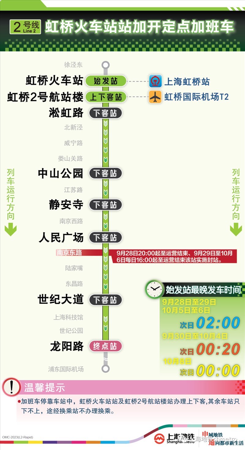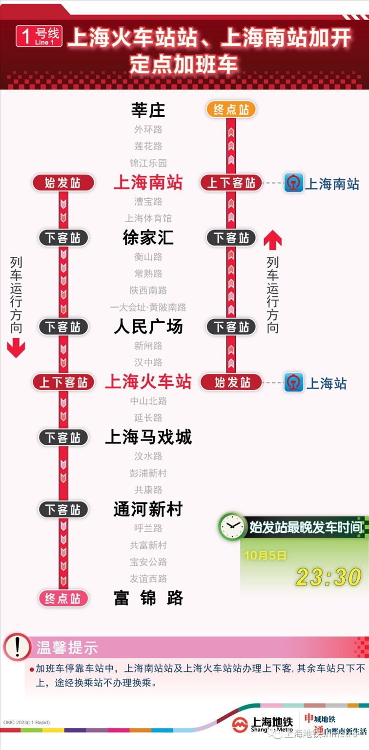 此外為做好節(jié)假日返程期間上?;疖囌?、虹橋火車站、上海南站的夜間客流疏散工作,10月5日,地鐵1號(hào)線在圖定基礎(chǔ)上實(shí)施定點(diǎn)加開方案,加開末班車發(fā)車時(shí)間至23:30;另10月8日地鐵2號(hào)線增加定點(diǎn)加班車班次,加開末班車發(fā)車時(shí)間至次日0:00。