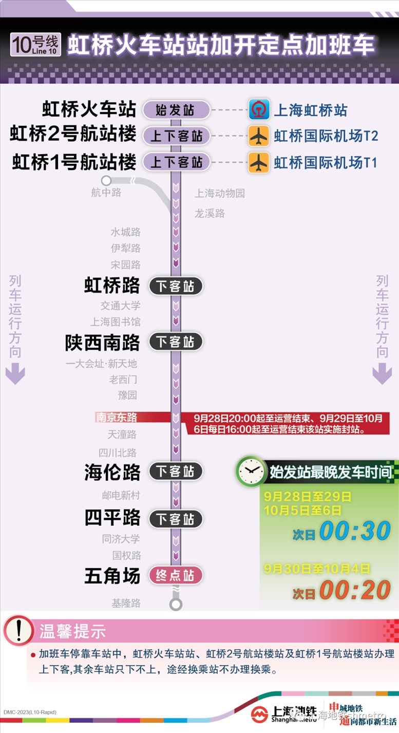 此外,9月28日20:00至運(yùn)營(yíng)結(jié)束,以及9月29日至10月6日的每日16:00至運(yùn)營(yíng)結(jié)束,地鐵2、10號(hào)線南京東路站,14號(hào)線豫園站計(jì)劃實(shí)施封站跳停。