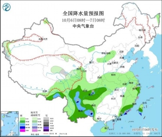 全國降水量預(yù)報圖(10月5日08時-6日08時)