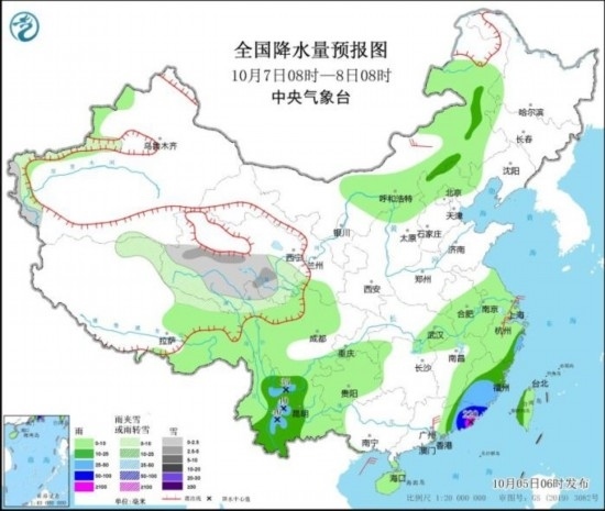 10月5日08時至6日08時,青海中西部、甘肅西部、西藏北部等地有小到中雪或雨夾雪,青海西北部局地有大雪,西藏東南部、陜西中南部、四川北部和東南部、貴州西北部、云南東北部、臺灣島等地部分地區(qū)有大到暴雨,其中,臺灣島東部部分地區(qū)有大暴雨,局地特大暴雨(250~320毫米)。內(nèi)蒙古中東部、黑龍江東北部、湖南北部、浙江等地部分地區(qū)有4~6級風(fēng)。