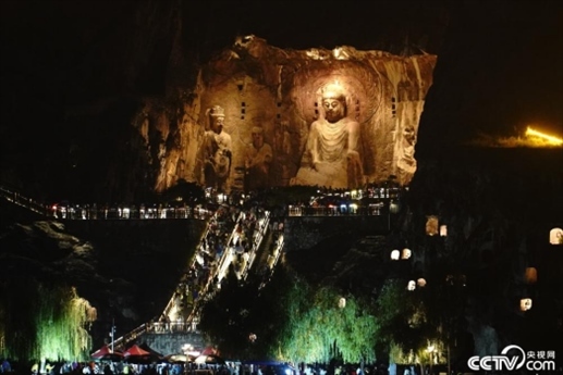 國慶假期,河南洛陽龍門石窟開啟夜游模式,吸引大量游客參觀游覽。