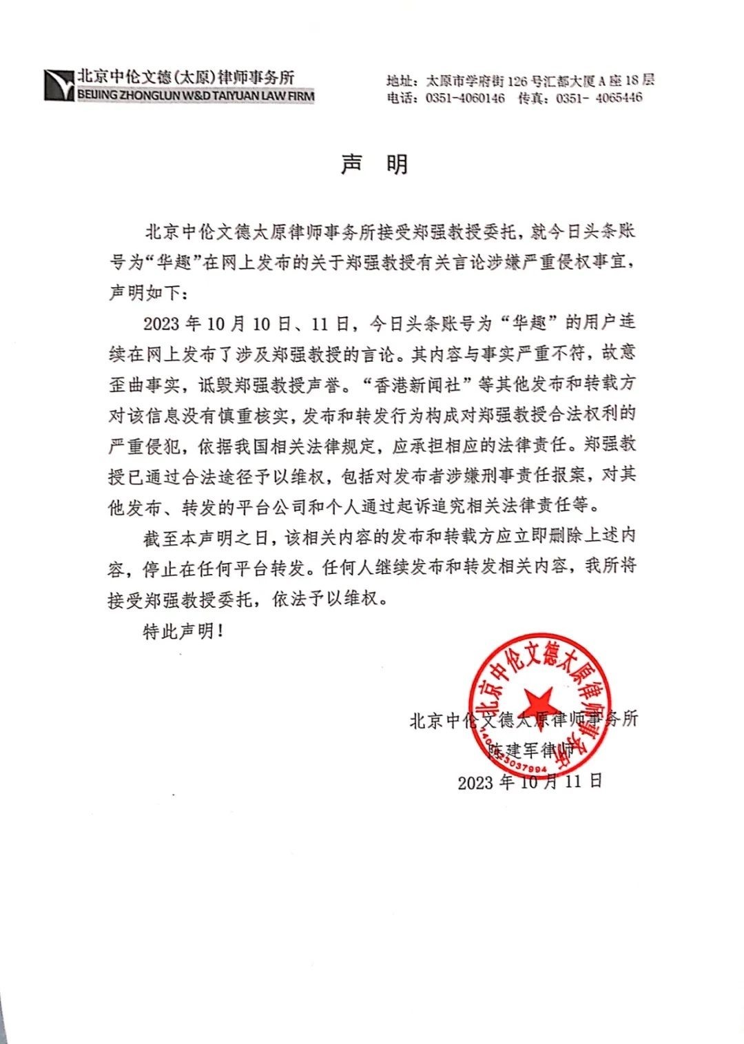 同時(shí),北京中倫文德太原律師事務(wù)所接受鄭強(qiáng)教授委托發(fā)表聲明,將依法予以維權(quán)。