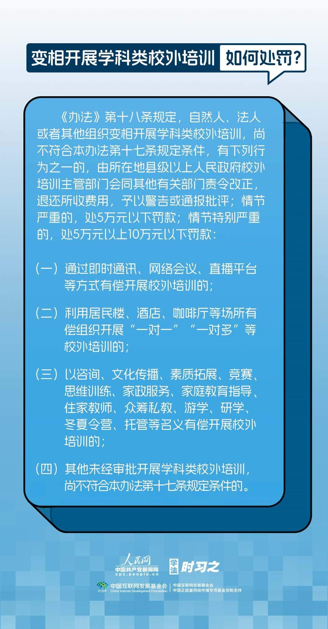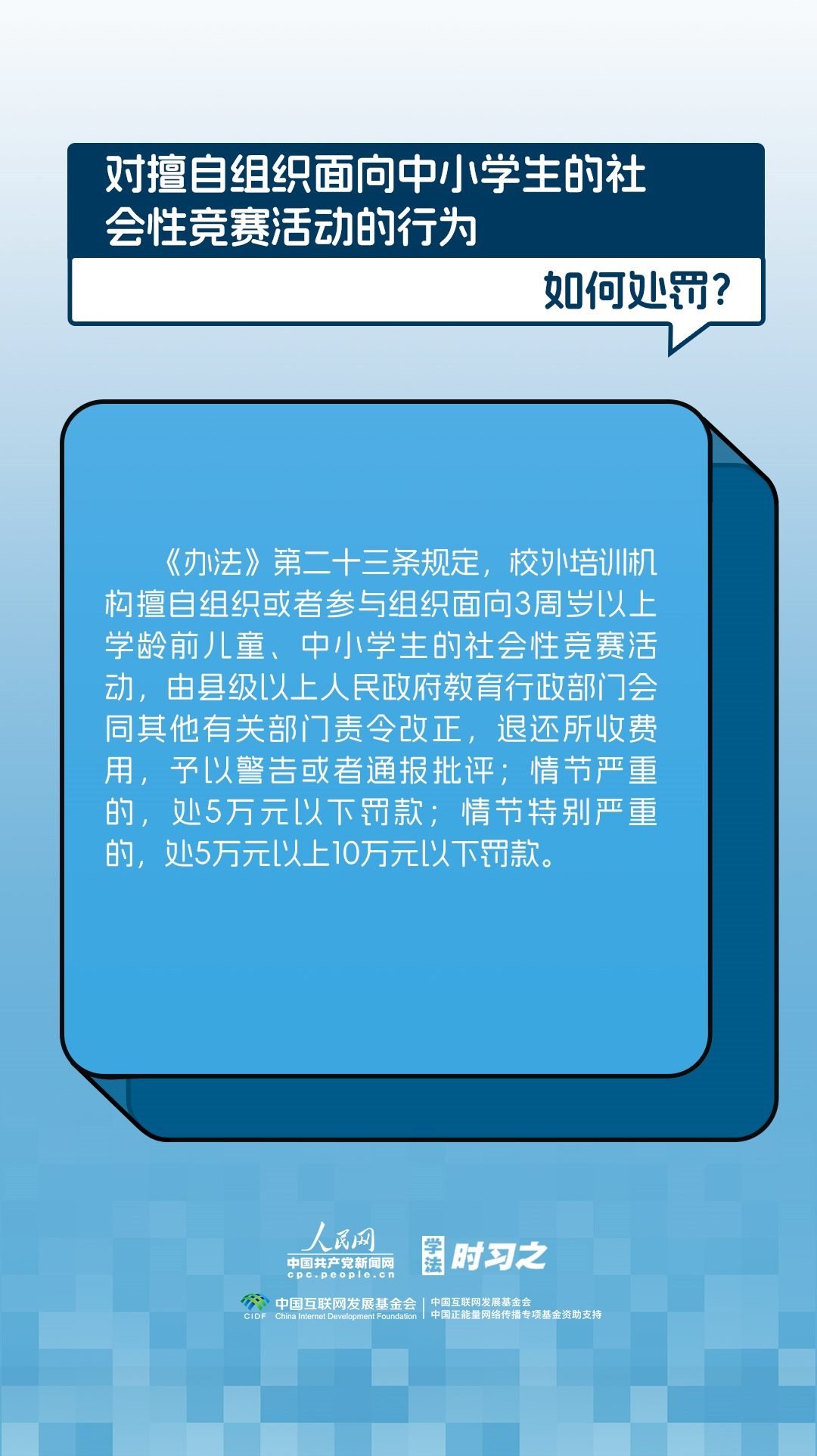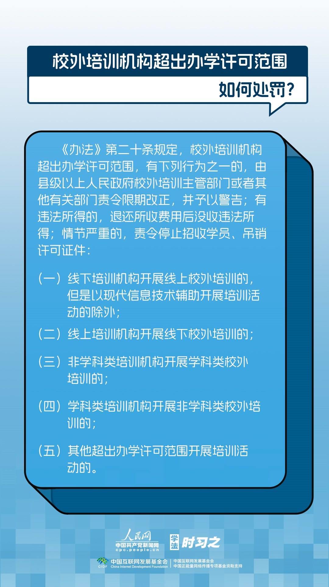 《校外培訓(xùn)行政處罰暫行辦法》(以下簡稱《辦法》)將于2023年10月15日起施行?!掇k法》提出了校外培訓(xùn)行政處罰總體要求。規(guī)定適用對象為面向社會招收3周歲以上學(xué)齡前兒童、中小學(xué)生,違法開展校外培訓(xùn)的自然人、法人或者其他組織。要求校外培訓(xùn)行政處罰應(yīng)當(dāng)遵循公正、公開的原則,堅(jiān)持處罰與教育相結(jié)合,引導(dǎo)自然人、法人或者其他組織自覺守法,共同抵制校外培訓(xùn)違法行為,營造有利于學(xué)生成長成才的良好環(huán)境。