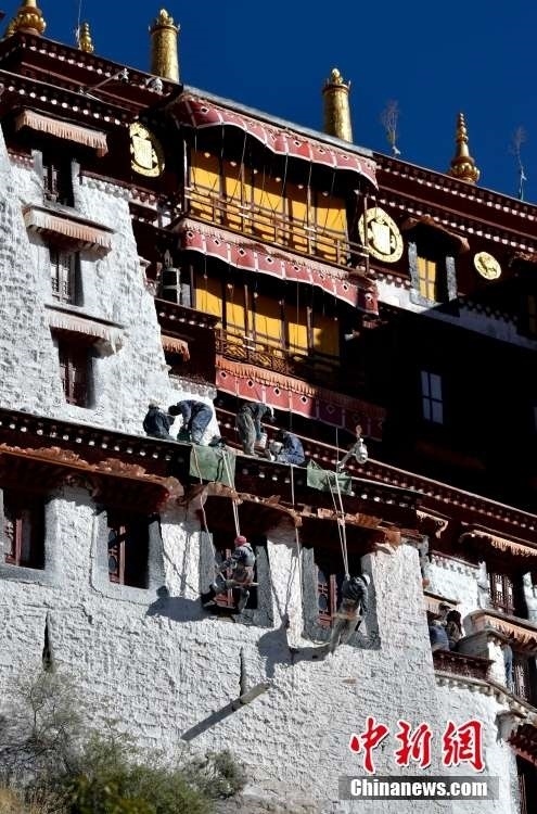 10月19日,西藏拉薩,工作人員對布達拉宮外墻噴灑涂料。每年秋冬交替時節(jié),布達拉宮外墻都要進行粉刷“美顏”。按照慣例,每季粉刷將在藏歷9月22日“神降節(jié)”前完成。
