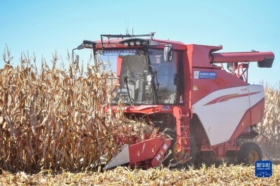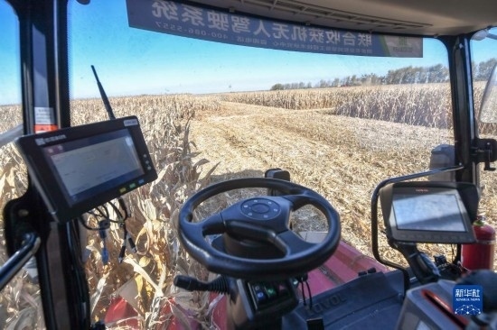 10月19日,在中國(guó)科學(xué)院“黑土糧倉(cāng)”科技會(huì)戰(zhàn)長(zhǎng)春示范區(qū)公主嶺示范基地,無(wú)人駕駛農(nóng)機(jī)在收獲玉米。